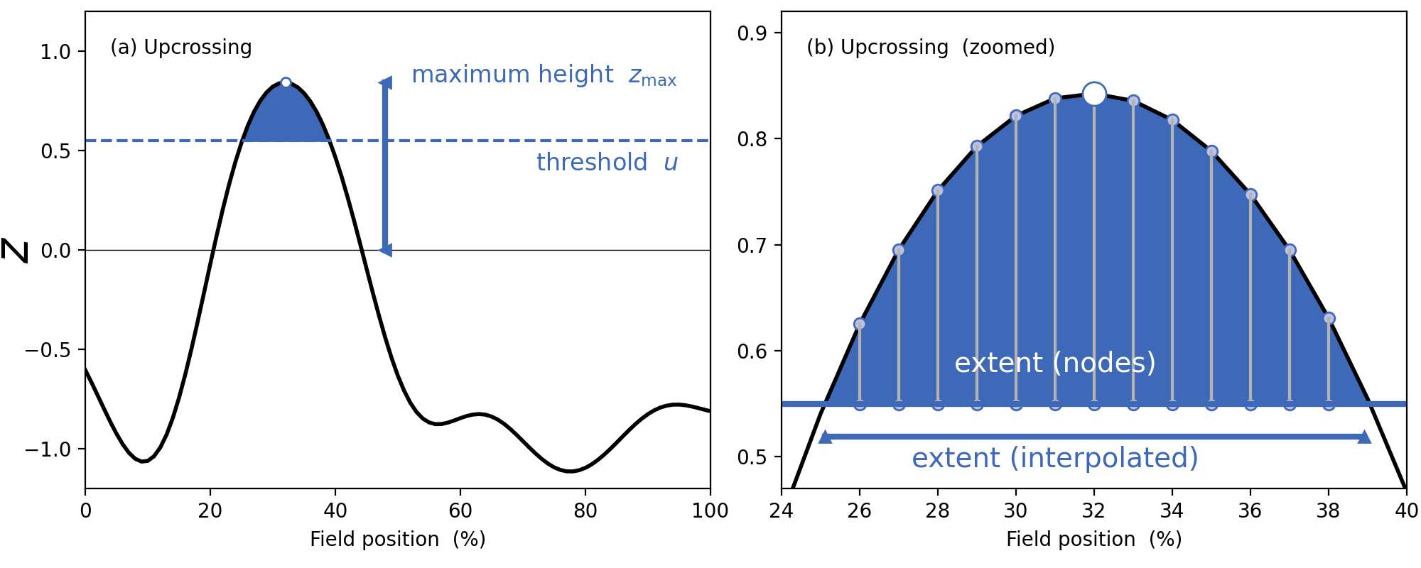 spm1d now interpolates to the critical threshold u as depicted in panel (b) of the figure below.