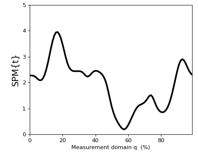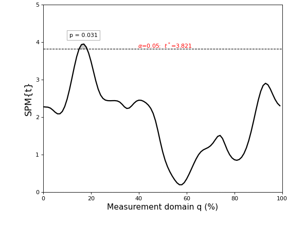 The result t is a 1D test statistic continuum, or equivalently a “Statistical Parametric Map” (SPM), denoted “SPM{t}”. It can be visualized as follows: