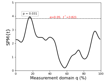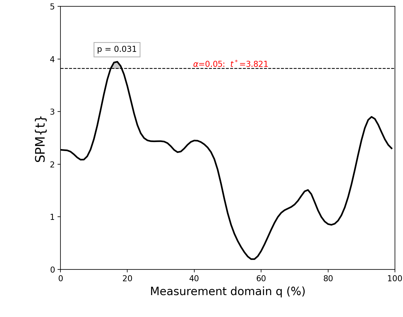 The red hashed line depicts the critical threshold at alpha = 5%. From a classical hypothesis testing perspective, the null hypothesis is rejected at alpha if the SPM{t} exceeds this threshold.